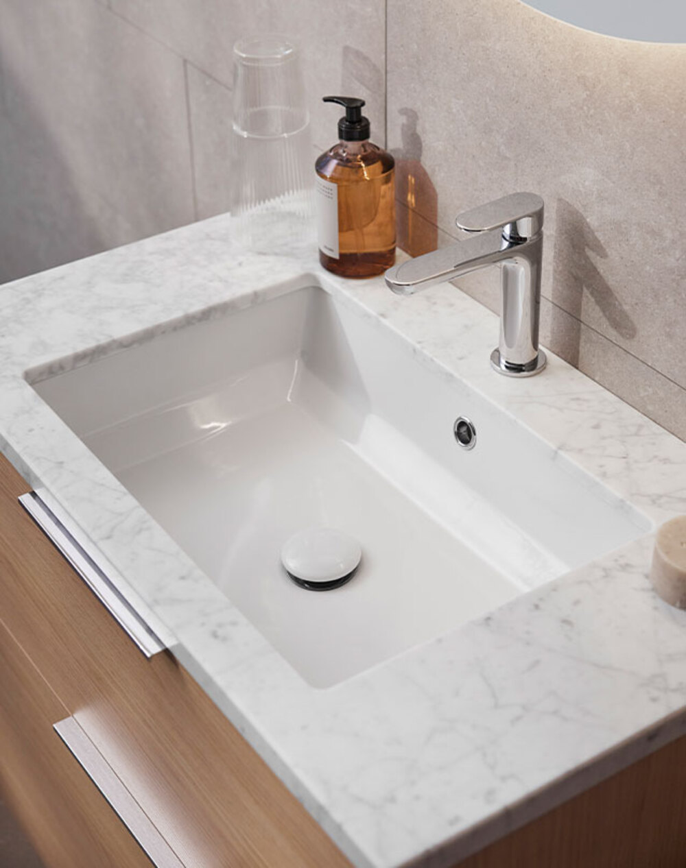 Möjlighet att välja underlimmat handfat till lådkommoder i serier City, Kensington, London och New York