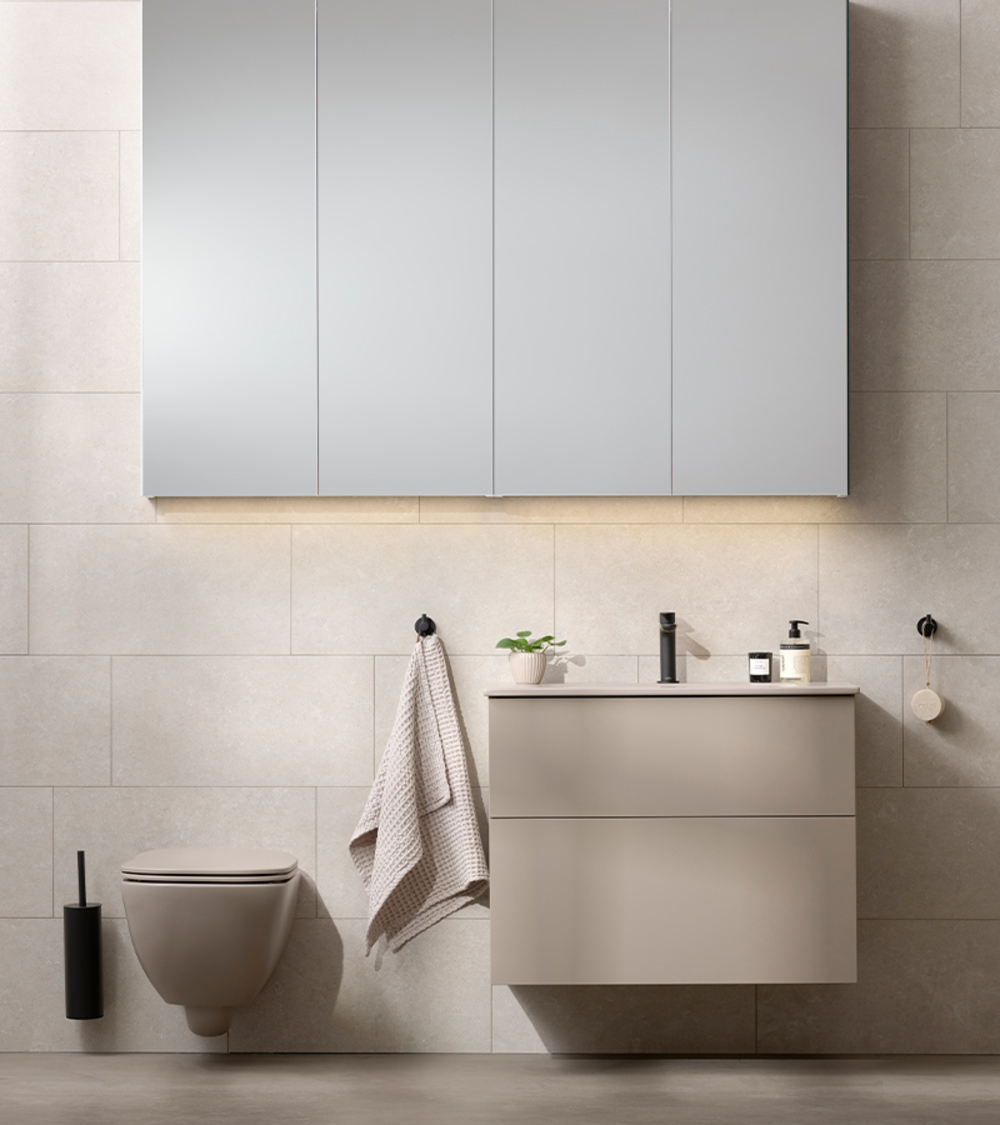 För en ännu mer exklusiv känsla finns tillval som integrerad sidobelysning och spegelpaneler på sidorna. Allt är utformat för att kombineras smidigt med övriga produkter från Miller Badrum.