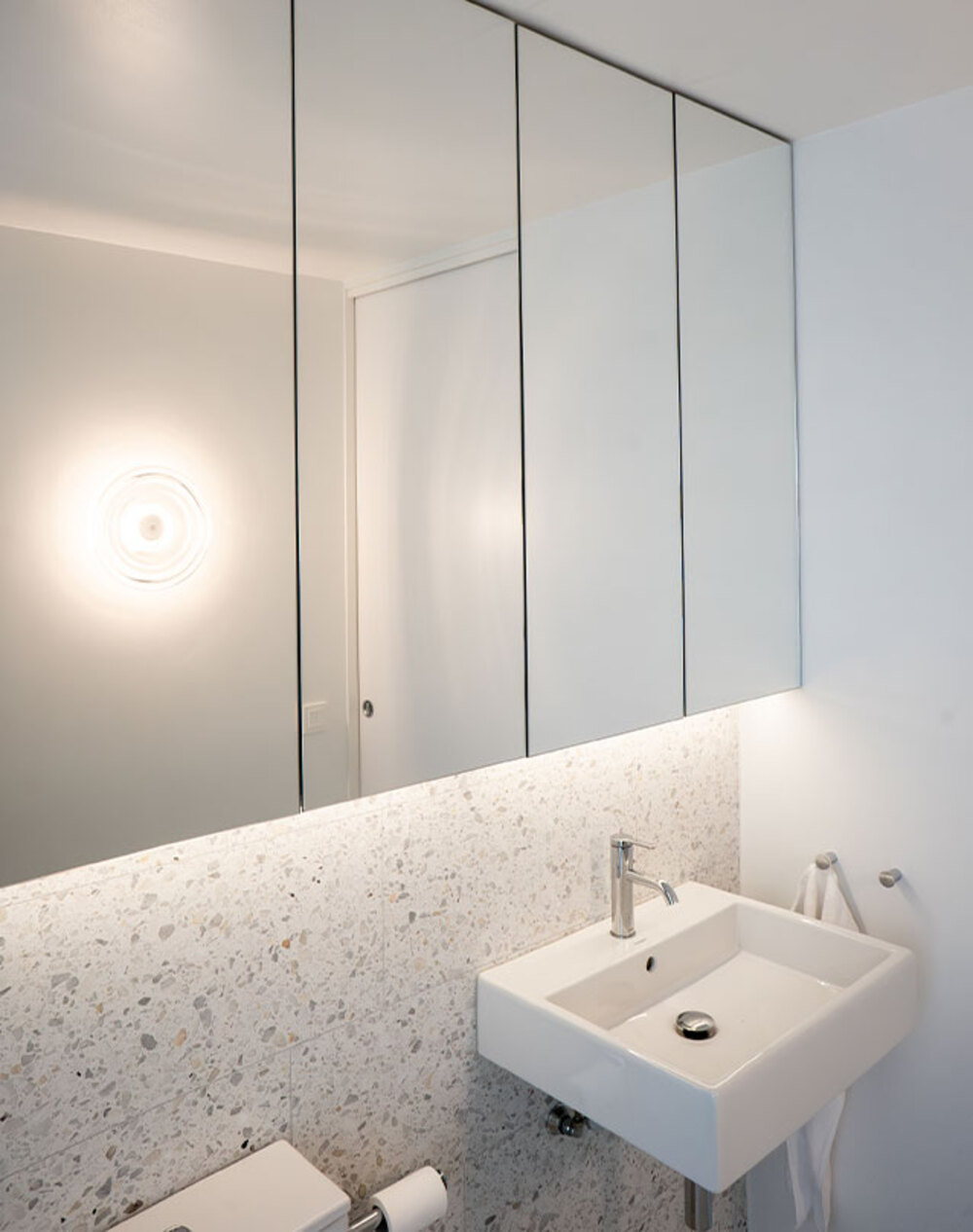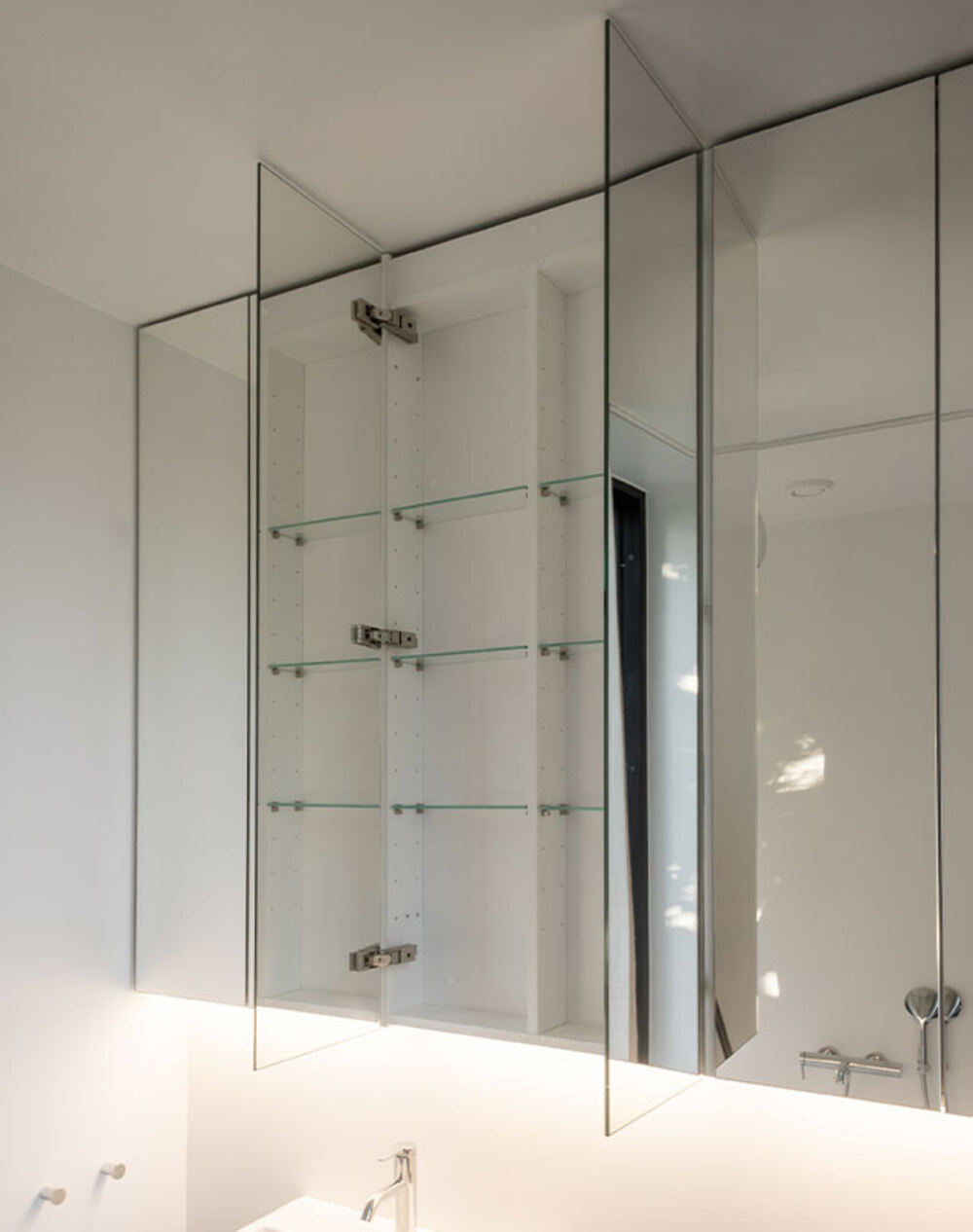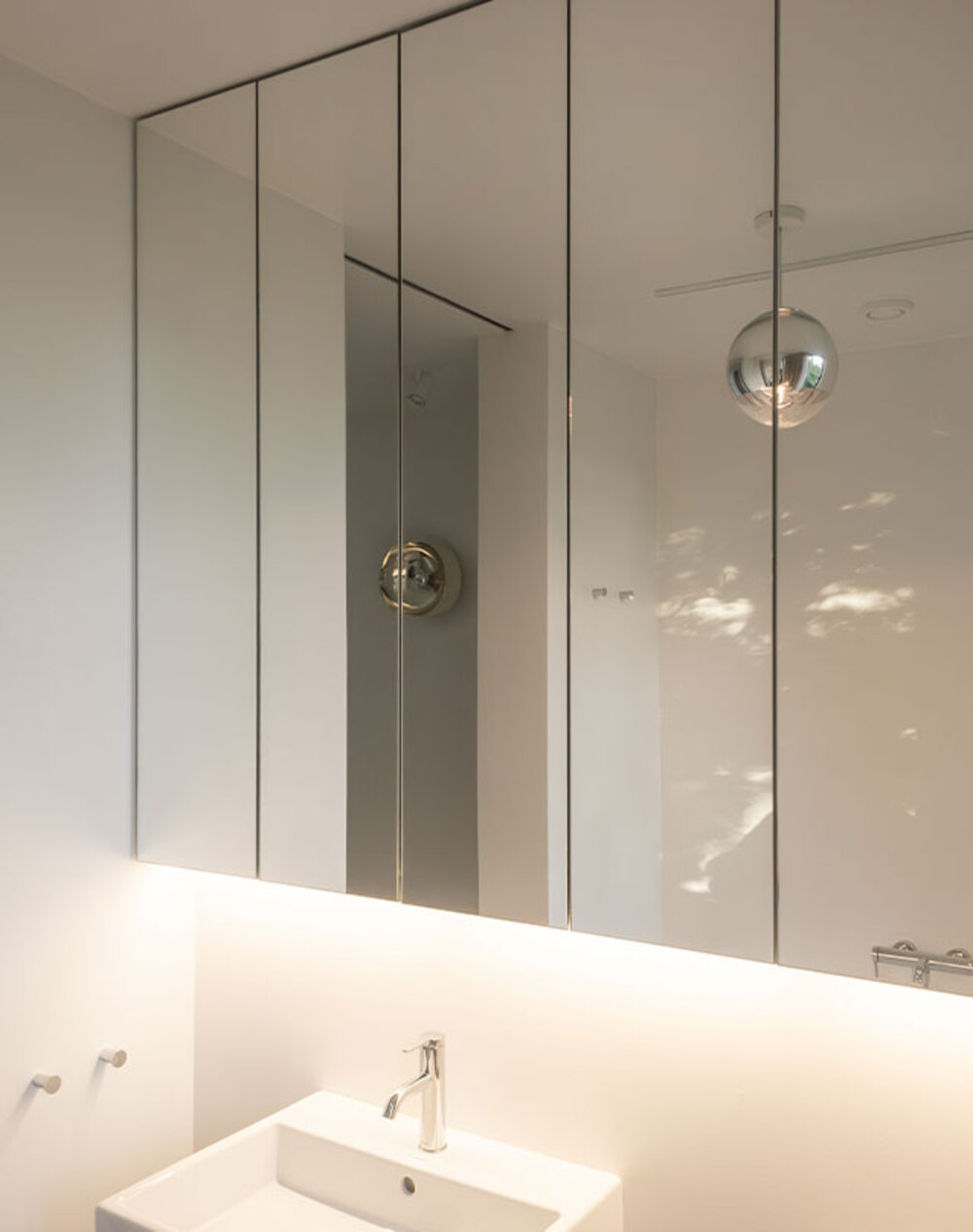 Sky High 80 cm med underbelysning - 2 spegelskåp sida vid sida. Utan tillval sidobelysning. Skåpen är dimbara via väggbrytare. Takhöjd ca 240 cm.
