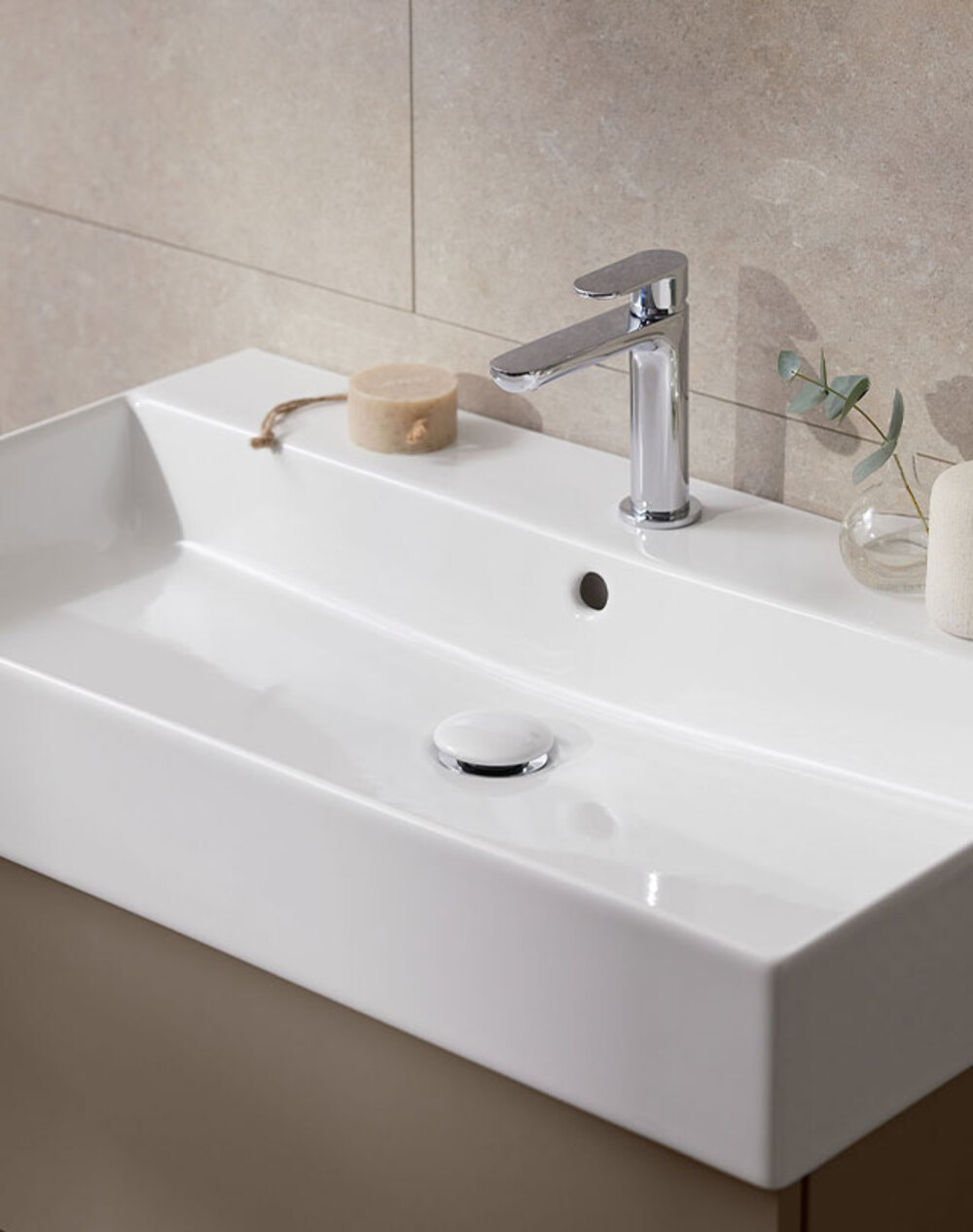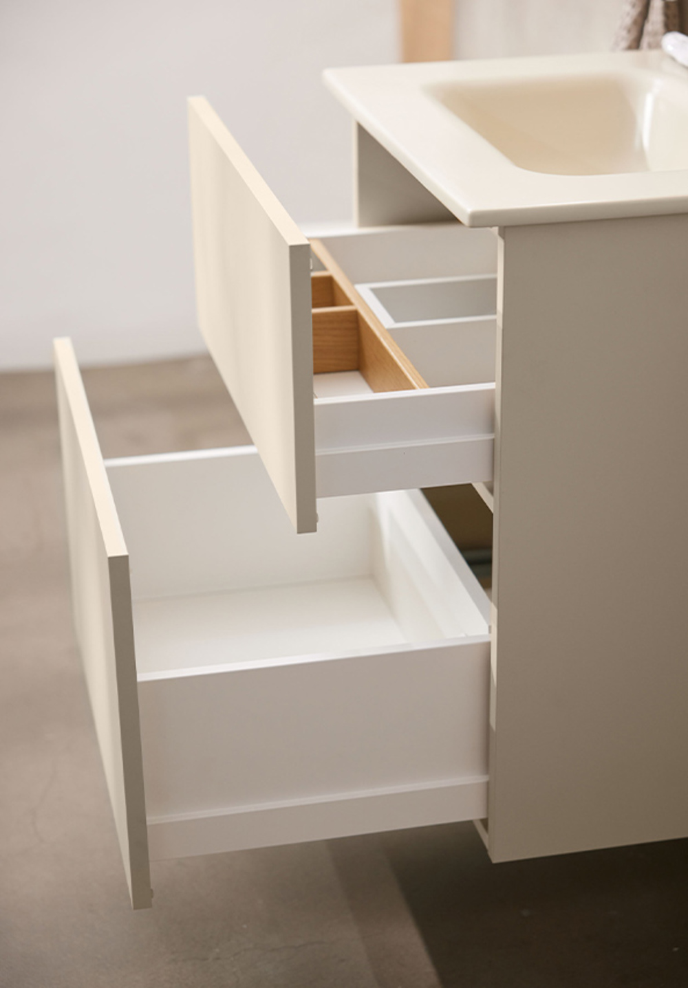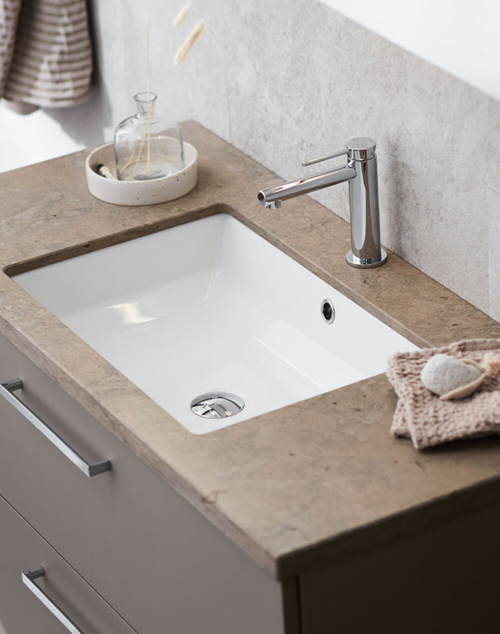 Lådkommoder i serie City går att få på flera olika sätt. Välj mellan heltäckande handfat i porslin eller olika varianter av bänkskiva - med handfat som står ovanpå bänkskivan. Eller varför inte stenbänkskiva med underlimmat porslinshandfat.