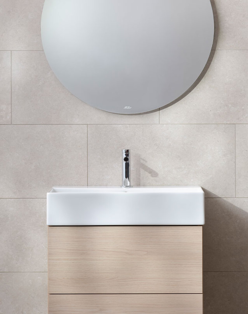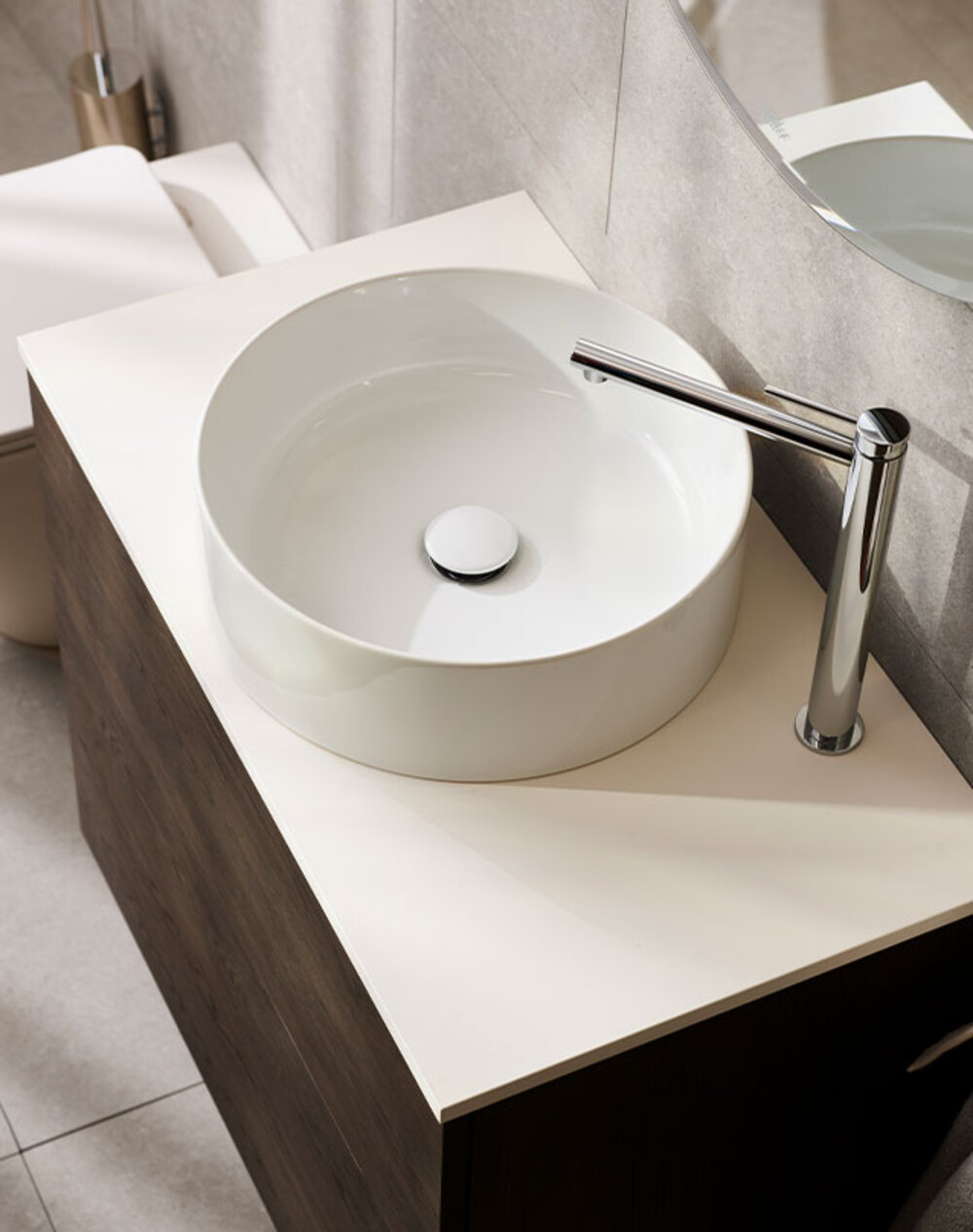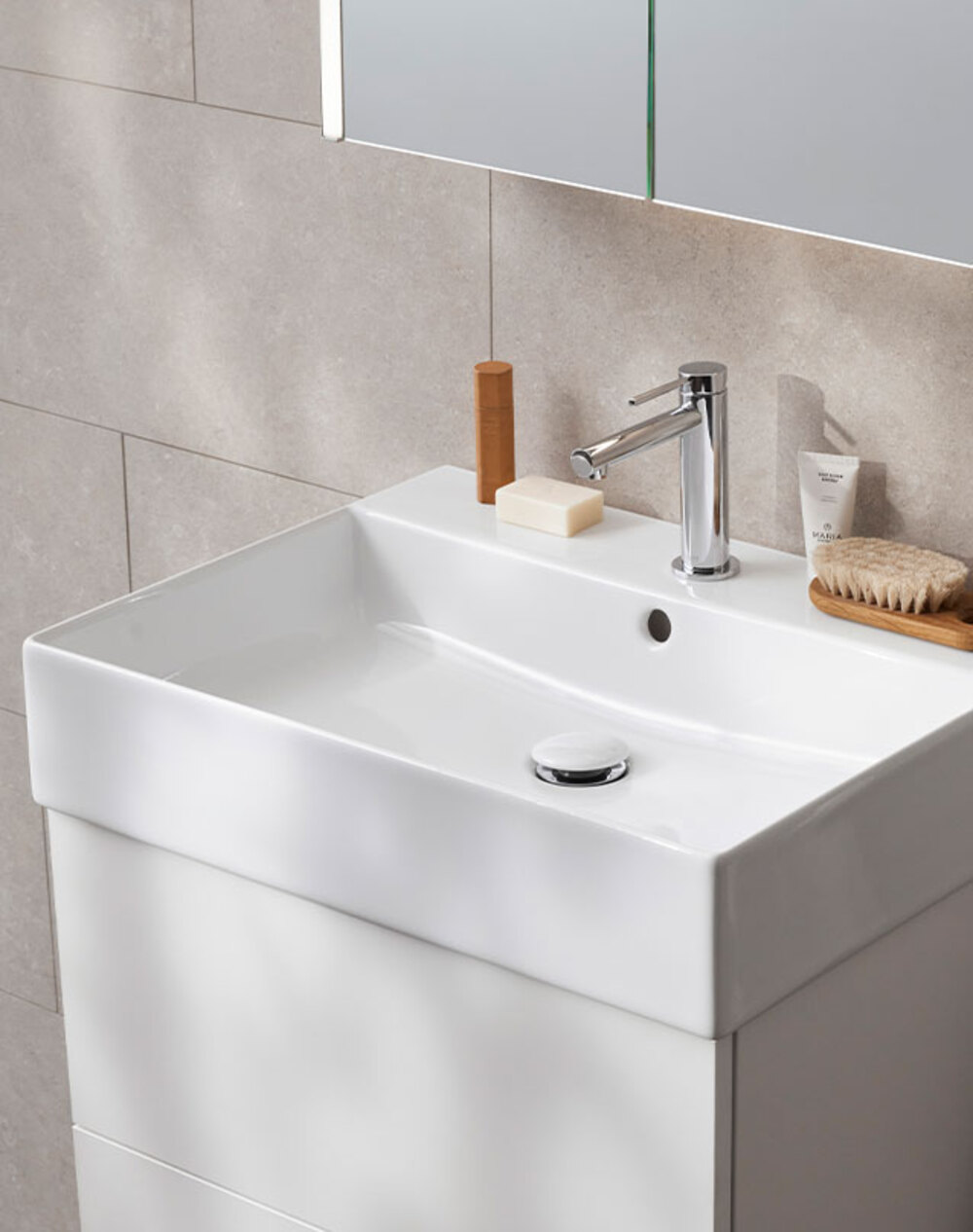 Edge heltäckande handfat har en tunn porslinskant och finns i flera färger. Komplettera handfatet med en matchande bottenventil i samma utförande som ditt porslin.