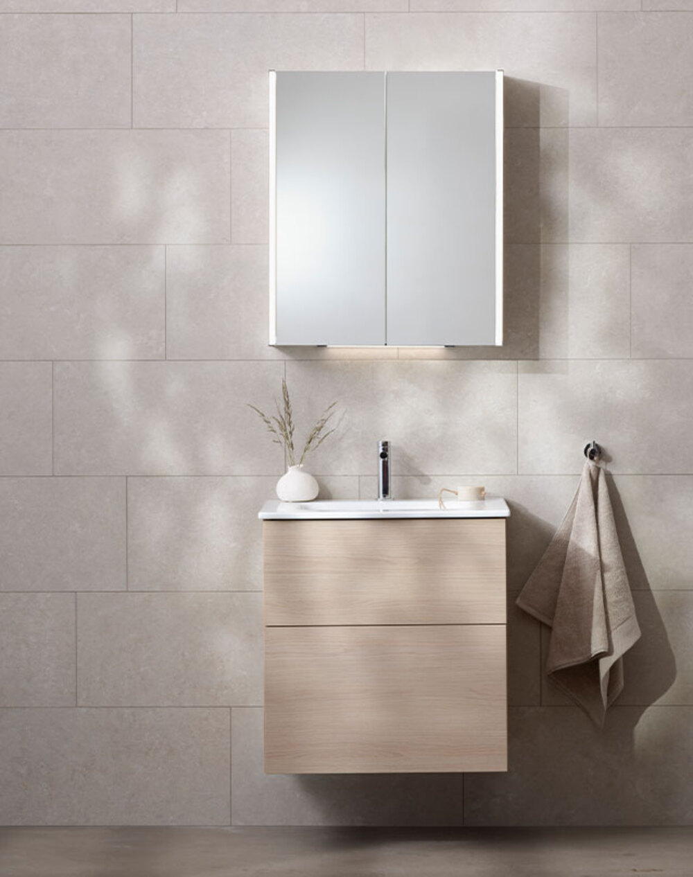 Lägre övre låda och hög undre låda, för att optimera din förvaring. Exempelvis kan eltandborste stå i nedersta lådan. Vita plåtsidor med rak insida.