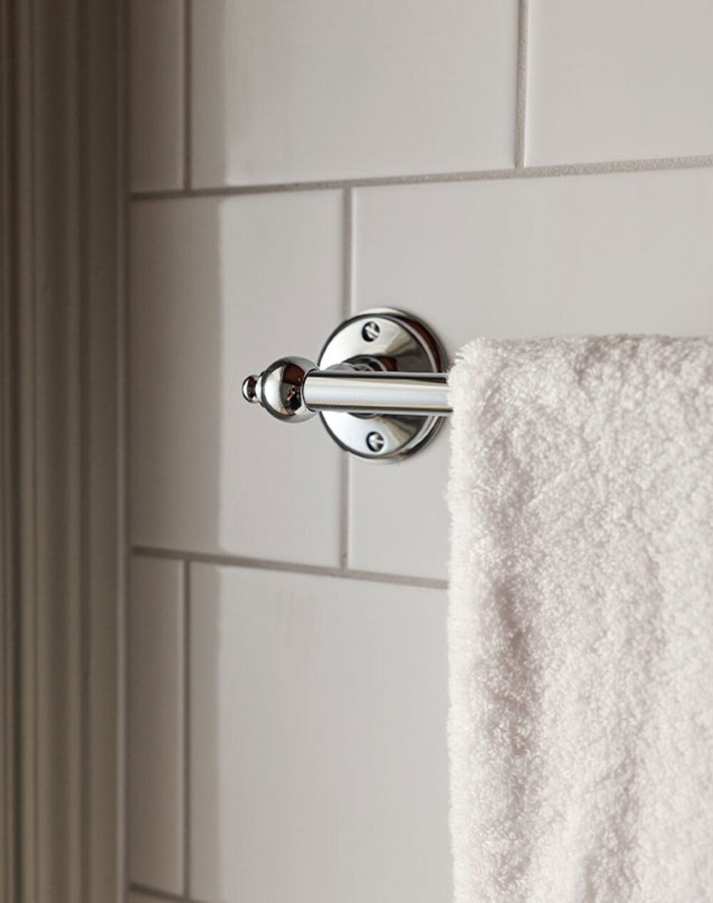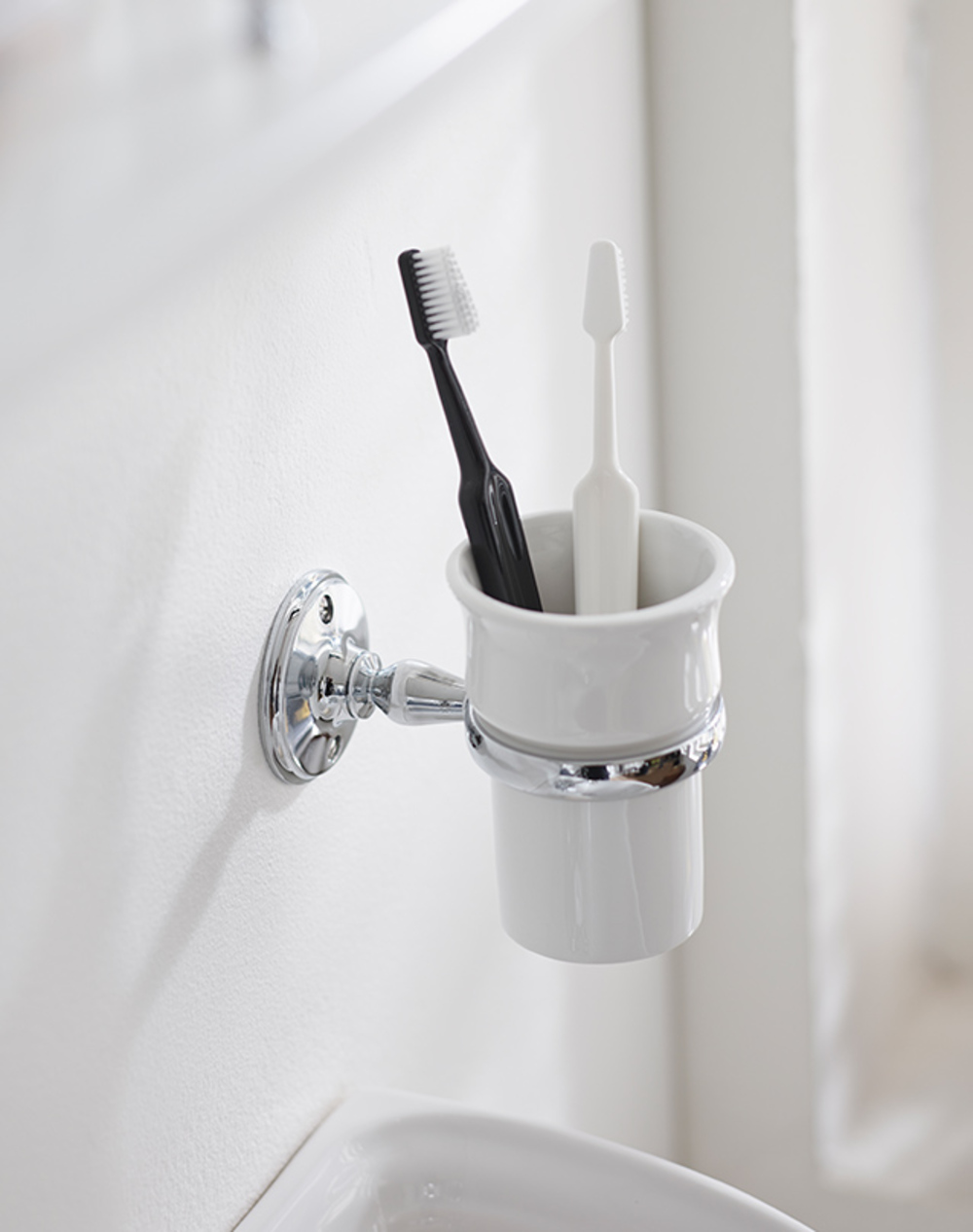 Muggen, tvålpumpen och tvålfatet i vitt porslin är tidlösa inslag i vår klassiska serie. Det blanka porslinet ger en fin kontrast mot fästen i krom eller mässing och framhäver seriens traditionella karaktär. Alla delar är avtagbara för enkel rengöring, vilket säkerställer ett bestående vackert utseende och praktisk användning.