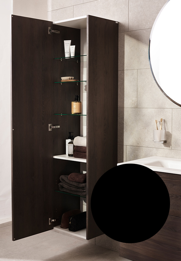 Ett rymligt väggmonterat högskåp frigör plats på golvet gör det lättare att städa samtidigt som det skapar mer visuellt utrymme. En fast vit trähylla för stabilitet och fyra flyttbara glashyllor med flexibilitet att förvara produkter av olika storlekar. Mjukstängande dörr finns som höger- eller vänsterhängt alternativ.