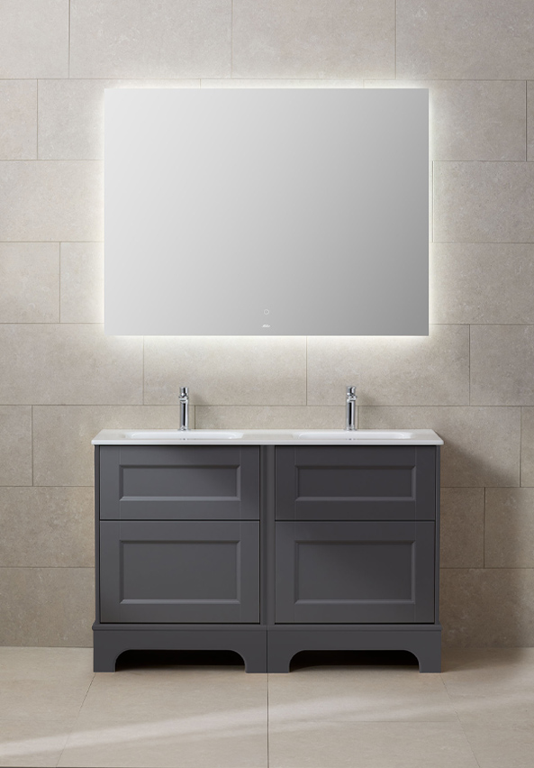 Möbelserie Kensington förenar det tidlöst vackra med den nya tidens formspråk. Den mjukt fasade kanten på stommarna, de vackra väldesignade ramspegelluckorna, omsorgen i varje detalj och den härliga finishen fyller ditt badrum med nya sköna känslor. Välj mellan ståtlig rustik golvsockel eller utnyttja utrymmet i ditt badrum med en vackert vägghängd kommod. Och njut av valet mellan behagligt vitt eller läckert grått. Kensington överraskar med gott om plats för både stil och känsla.