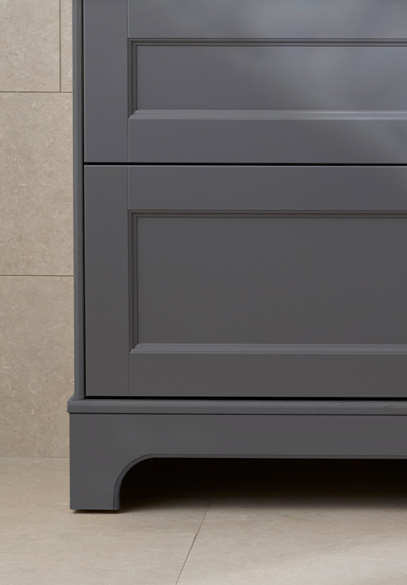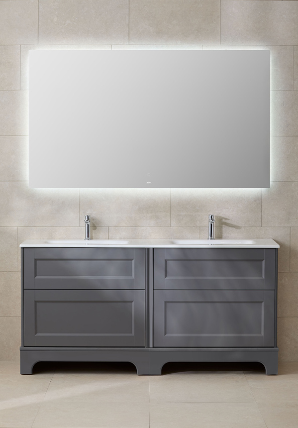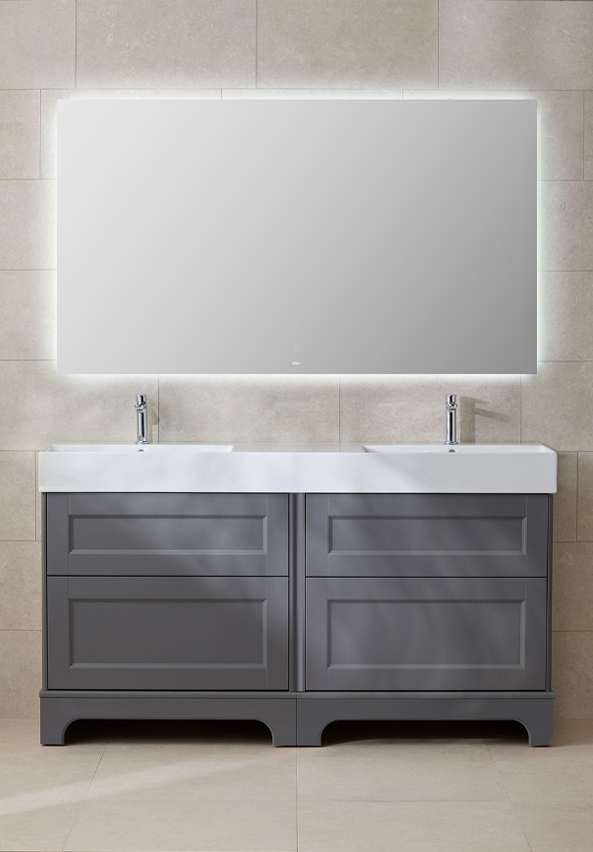 Möbelserie Kensington förenar det tidlöst vackra med den nya tidens formspråk. Den mjukt fasade kanten på stommarna, de vackra väldesignade ramspegelluckorna, omsorgen i varje detalj och den härliga finishen fyller ditt badrum med nya sköna känslor. Välj mellan ståtlig rustik golvsockel eller utnyttja utrymmet i ditt badrum med en vackert vägghängd kommod. Och njut av valet mellan behagligt vitt eller läckert grått. Kensington överraskar med gott om plats för både stil och känsla.