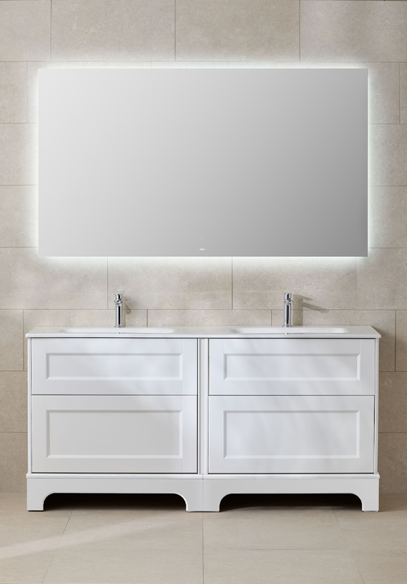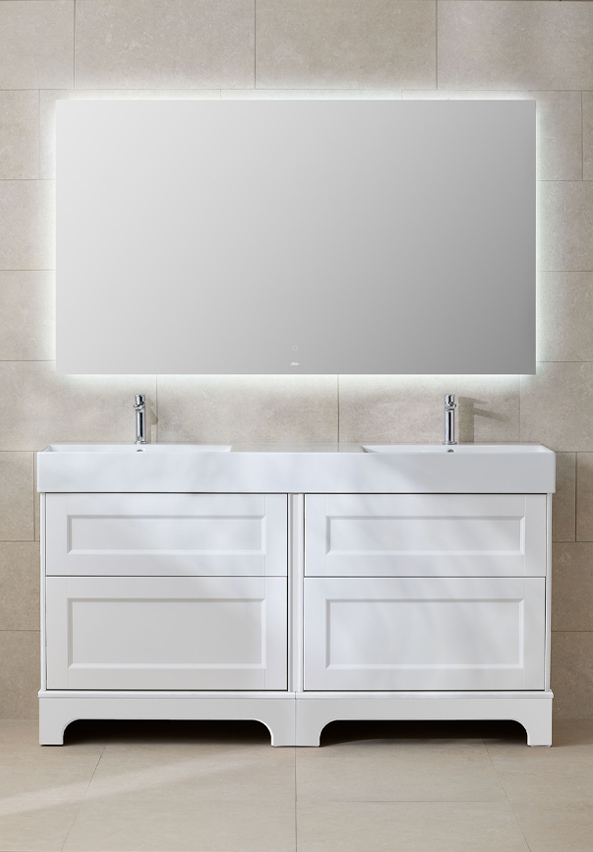 Möbelserie Kensington förenar det tidlöst vackra med den nya tidens formspråk. Den mjukt fasade kanten på stommarna, de vackra väldesignade ramspegelluckorna, omsorgen i varje detalj och den härliga finishen fyller ditt badrum med nya sköna känslor. Välj mellan ståtlig rustik golvsockel eller utnyttja utrymmet i ditt badrum med en vackert vägghängd kommod. Och njut av valet mellan behagligt vitt eller läckert grått. Kensington överraskar med gott om plats för både stil och känsla.