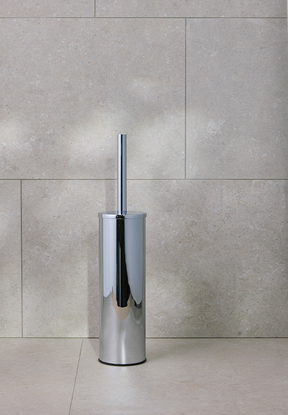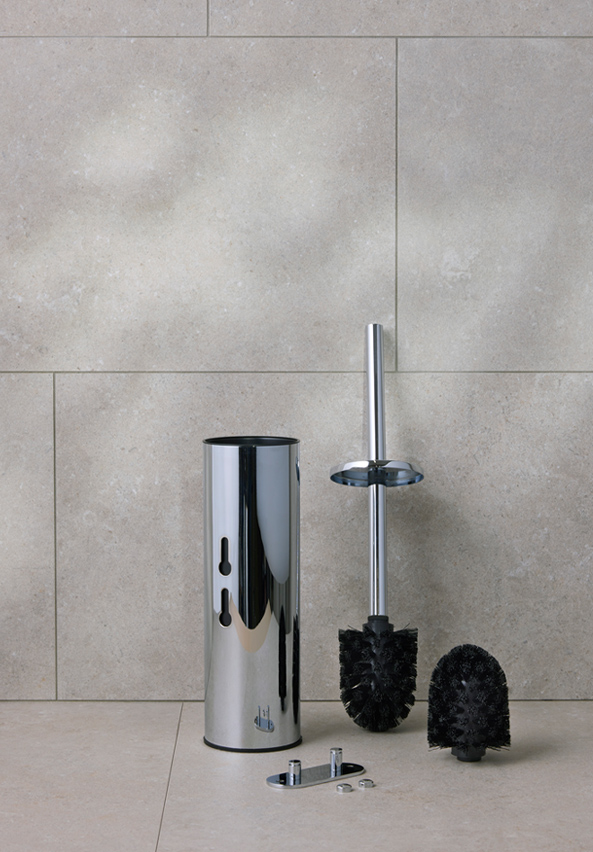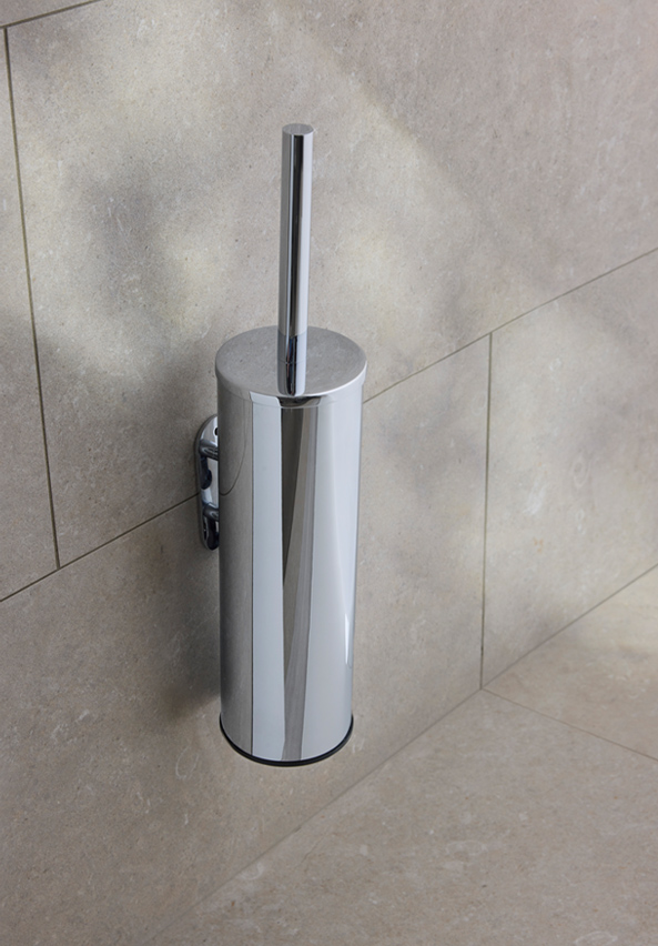 Fristående eller vägghängt toalettborstset. Skruva eller tejpa med medföljande 3-M tejp. Reservborsthuvud medföljer.