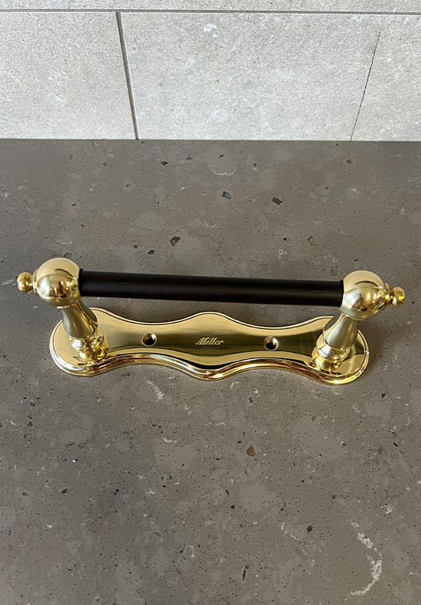 En tidlös och elegant toalettpappershållare med dubbla väggfästen för extra stabilitet. Den vackert svängda bakplattan matchas stilfullt med den mörka trästången, och kombinerar funktion med klassisk design. Toalettrullen träs enkelt på den robusta trästången, som sitter rejält och stadigt på plats.