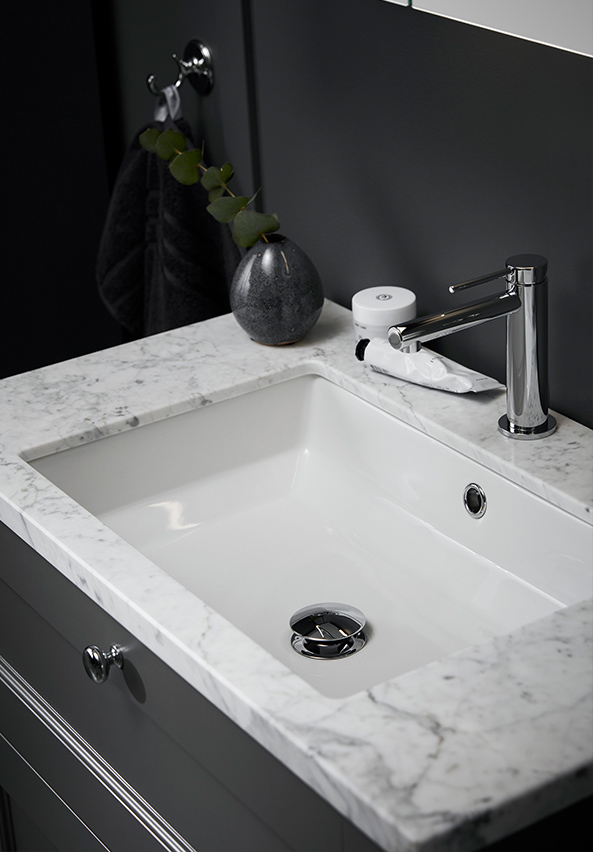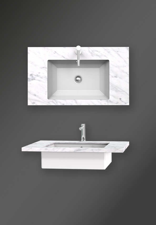 Stenbänskiva av Carraramarmor med underlimmat porslinshandfat. Passar möbelserier Kensington och City.