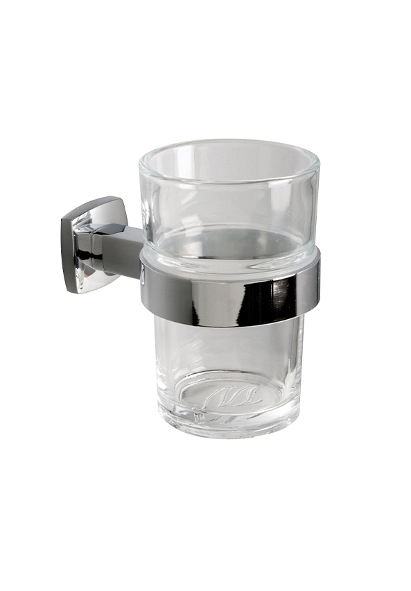 The Holder is crafted mostly from solid brass with a durable chrome finish. The Tumbler is made of clear glass. The product features a full fix mounting system for added stability. Part of a discontinued range – this product is brand new and supplied in its original packaging. Original price: £31