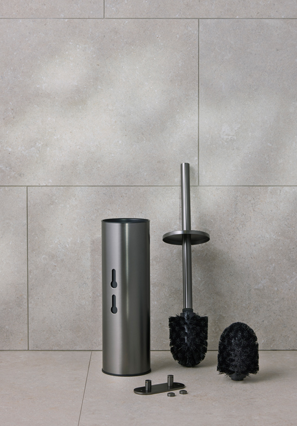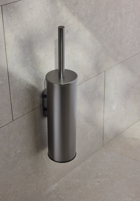 Freestanding or wall-hung toilet brush set. Screw or tape with included 3-M tape. Spare brush head included.